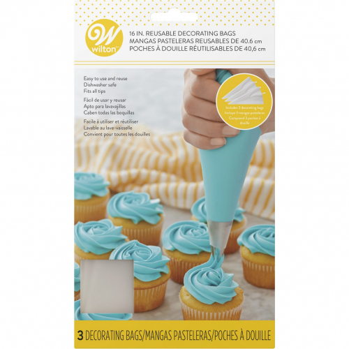 Eliminate waste with these 16-inch Reusable Piping Bags for Cake Decorating by Wilton. Easy to use with or without a coupler, these bags can be trimmed to fit any standard or large piping tip. Simply cut the end of the decorating bag to fit your coupler or piping tip, then fill with buttercream frosting or royal icing. When you're done, remove any remaining frosting or icing and hand wash with warm, soapy water. You can also place the bags in the top rack of your dishwasher for easier and quicker cleaning. Each bag also includes a convenient hang tag for easy storage and drying. Great for using again and again, these reusable decorating bags get the job done time and time again!